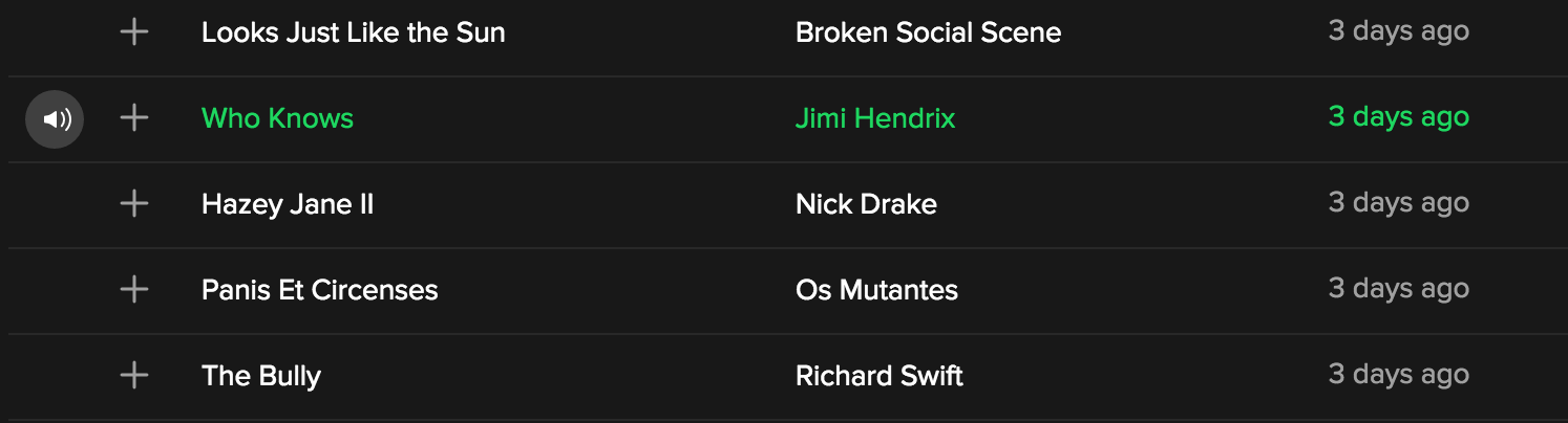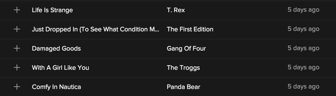 What a great playlist! It started with the crazy Brigitte Bardot/Serge Gainsbourg duet and ended with the slamming ESG track. Plus there were two brilliant covers from The Slits and Buddy Miles. My only quibble, there were THREE repeats. Leonard Cohen, Thirteenth Floor Elevators and Patto. Spotify, I promise you won’t run out of songs. The only problem is now that everything is just right the three bears will come home.
