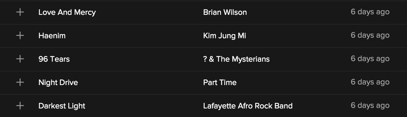 Well, hot damn! Did Spotify get it right or what? Week 9 nails it on so many fronts. It’s got great tunes almost across the board, plenty of variety and both old and new stuff I have never heard. There are five classic funk and soul tracks from the seventies, four great bands that are new to me, some loopy French pop and wild orchestral psychedelic folk from Korea. Let’s call this week the Goldilocks Playlist. It is just right.